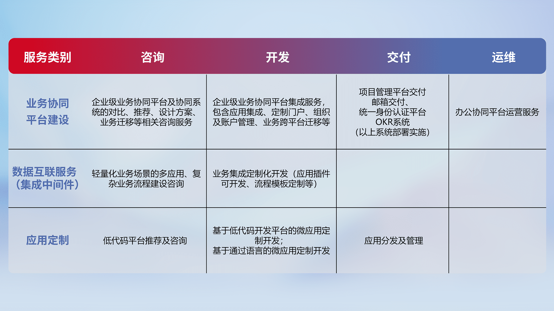 针对钉钉、、、、企微、、、、IDaas等平台级产品提供产品的规划、、方案、、交付、、、、定制化开发等服务,,实现如统一协同办公、、、智能客户服务、、、、混合会议管理、、、、智能数据查询、、、等业务场景,,实现数字化转型。。。
